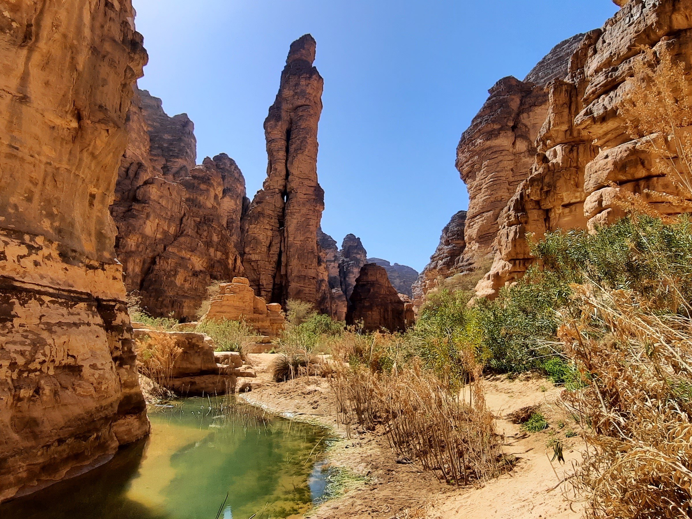 Après une brève découverte de Djanet, la « Perle du Tassili », nous quittons la ville en direction du site de Terarart. Là, la roche porte depuis des millénaires de remarquables gravures rupestres, parmi les plus belles du Sahara, dont la célèbre « vache qui pleure ». Nous poursuivons ensuite notre route au cœur d’un paysage spectaculaire de formations de grès sculptées par le temps, formant un véritable labyrinthe naturel : Tikoubaouine. Nous rejoignons ensuite l’oued Essendilène, impressionnante faille creusée dans le grès, avant de continuer à pied jusqu’à la guelta, véritable écrin d’eau miroitante blotti au milieu des lauriers-roses.