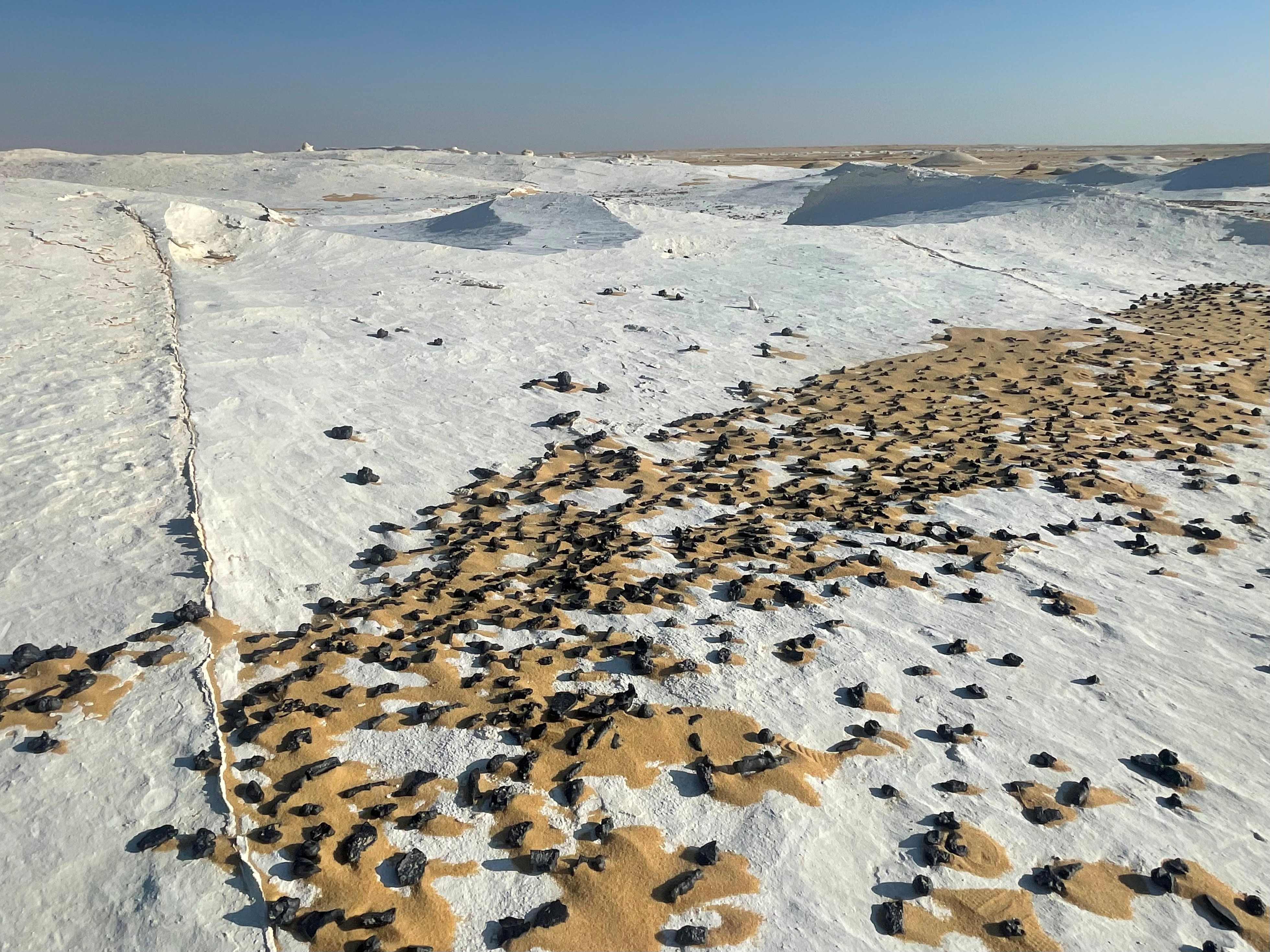 Reprenant la route, nous filons plein sud à travers de vastes étendues de désert noir, surmontées de plateaux tabulaires et coniques tachetés de langues de sable jaune. Nous quittons la route pour rejoindre hors piste El Selm, splendide site de dunes et de sommets ronds. Nous repartons à travers une série d’oueds et de regs vers le désert blanc. Nous allons alors découvrir les formes immaculées de ce qui aurait pu être une immense ville blanche où ne seraient restées sur des kilomètres carrés que d’immenses statues de craie dédiées à des divinités imaginaires : sphinx, allée de béliers, têtes de géants, champignons titanesques. Par endroits, le terrain prend l’apparence d’un immense champ de neige pétrifiée ou de vagues de glace. Balade à pied avant le coucher du soleil au moment où les couleurs s’adoucissent et les ombres s’allongent.