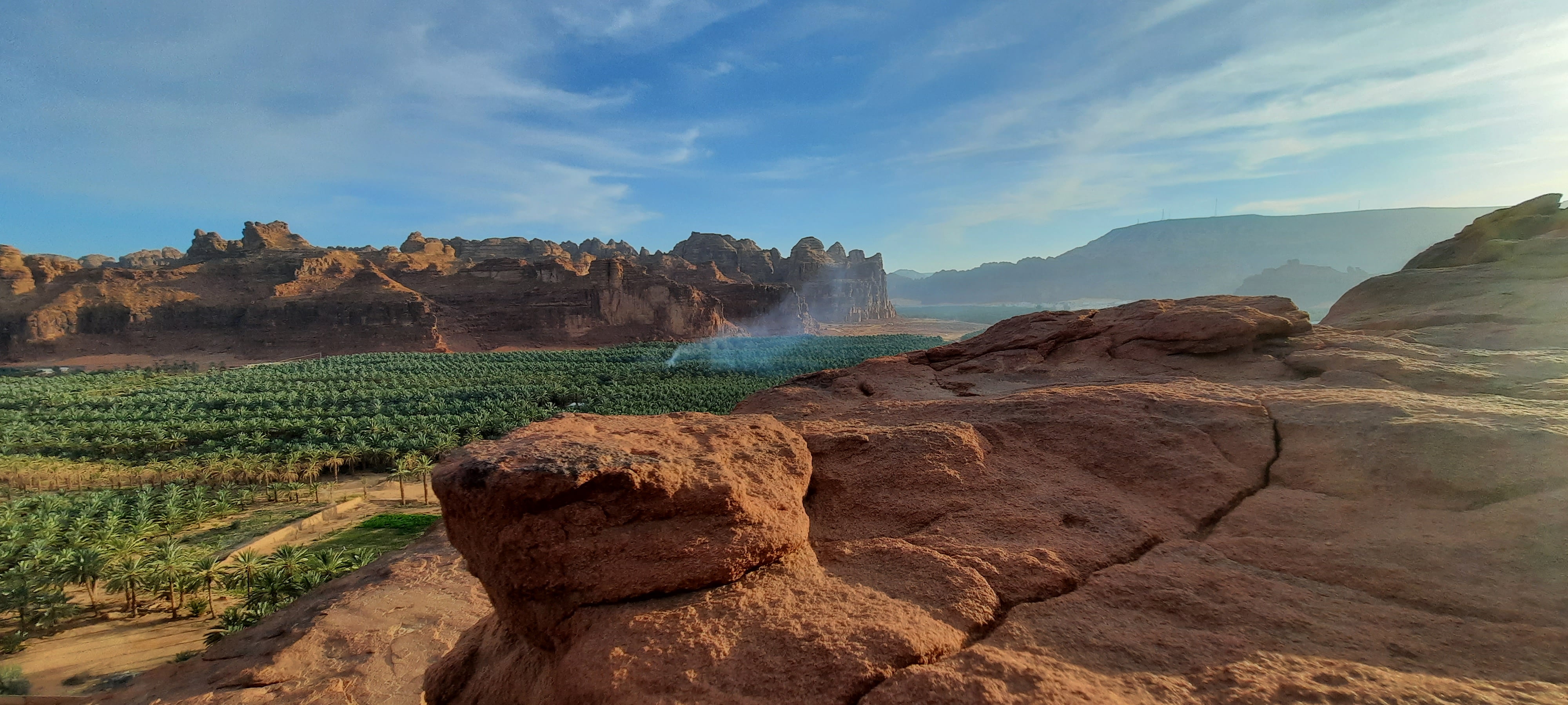 Nous visitons ensuite la vieille ville d'Al'Ula située au centre de la palmeraie. Bien qu'abandonné en 1980, se trouve à son emplacement de l'époque, le village d'Al Deerah. Largement dégradé, il permet tout de même de se représenter avec exactitude la physionomie de la ville d'antan dont les origines remonteraient au VIIe siècle. Nous pouvons observer d'anciennes inscriptions lihyanites et les ruelles étroites faites de boue et de palmier. Nous finissons cette journée en admirant le panorama exceptionnel que nous offre le belvédère du Harrat, sur toute la région.